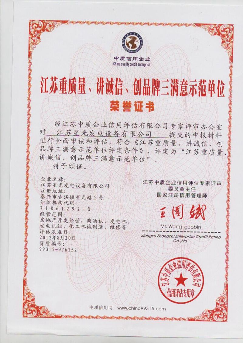 江蘇重質量、講誠信、創品牌三滿意示范單位榮譽